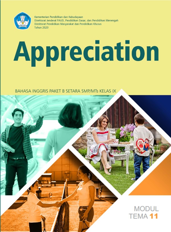 Modul Paket B Kelas 9, Tema 11: Appreciation, merupakan terbitan kemdikbud dengan pengarang Sari Purnamawati, Suci Paresti. Dicetak menggunakan kertas isi HVS 70 gr dengan kualitas cetak terbaik. Buku ini terdiri dari 72 halaman.