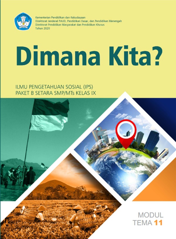 Modul Paket B Kelas 9, Tema 11: Dimana Kita?, merupakan terbitan kemdikbud dengan pengarang Sulaiman Hasan, S.Pd, M.Pd, Dra. Siti Fatonah, Aminullah,S.Pd, M.A. Dicetak menggunakan kertas isi HVS 70 gr dengan kualitas cetak terbaik. Buku ini terdiri dari 68 halaman.