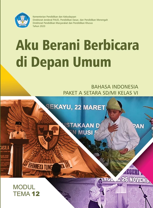 Buku Modul Paket A Kelas 6, Tema 12: Aku Berani Berbicara di Depan Umum, merupakan terbitan kemdikbud dengan pengarang Dra. Tika Hatikah, M.Hum. Dicetak menggunakan kertas isi HVS 70 gr dengan kualitas cetak terbaik. Buku ini terdiri dari 40 halaman